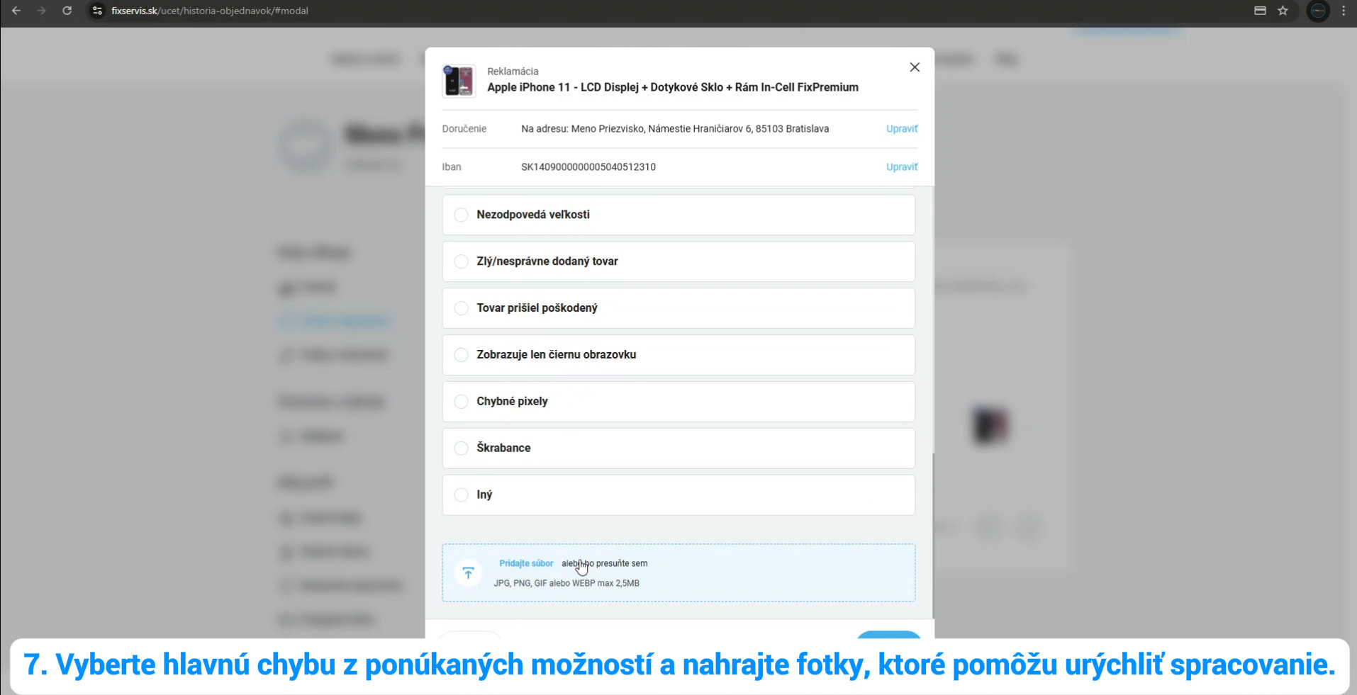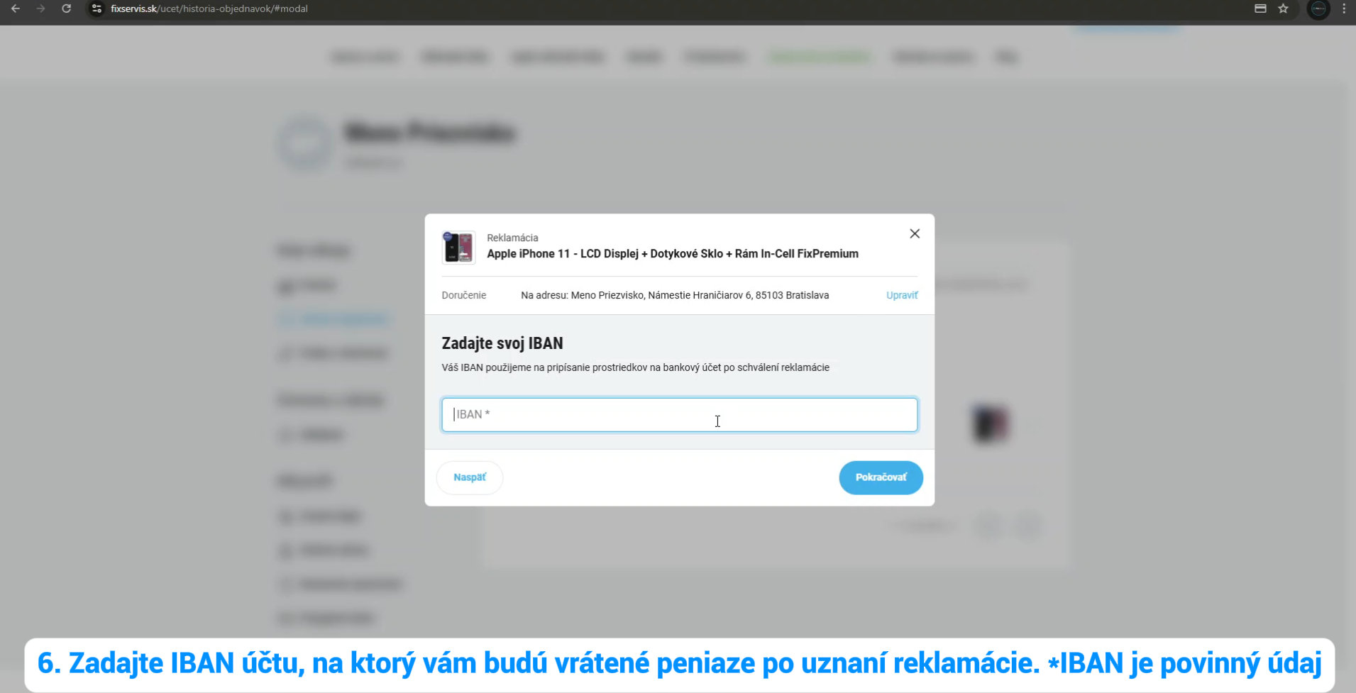 6. Zadajte IBAN v prípade uznanej reklamácie použijeme tento údaj na vrátenie peňazí. *IBAN je povinným údajom.