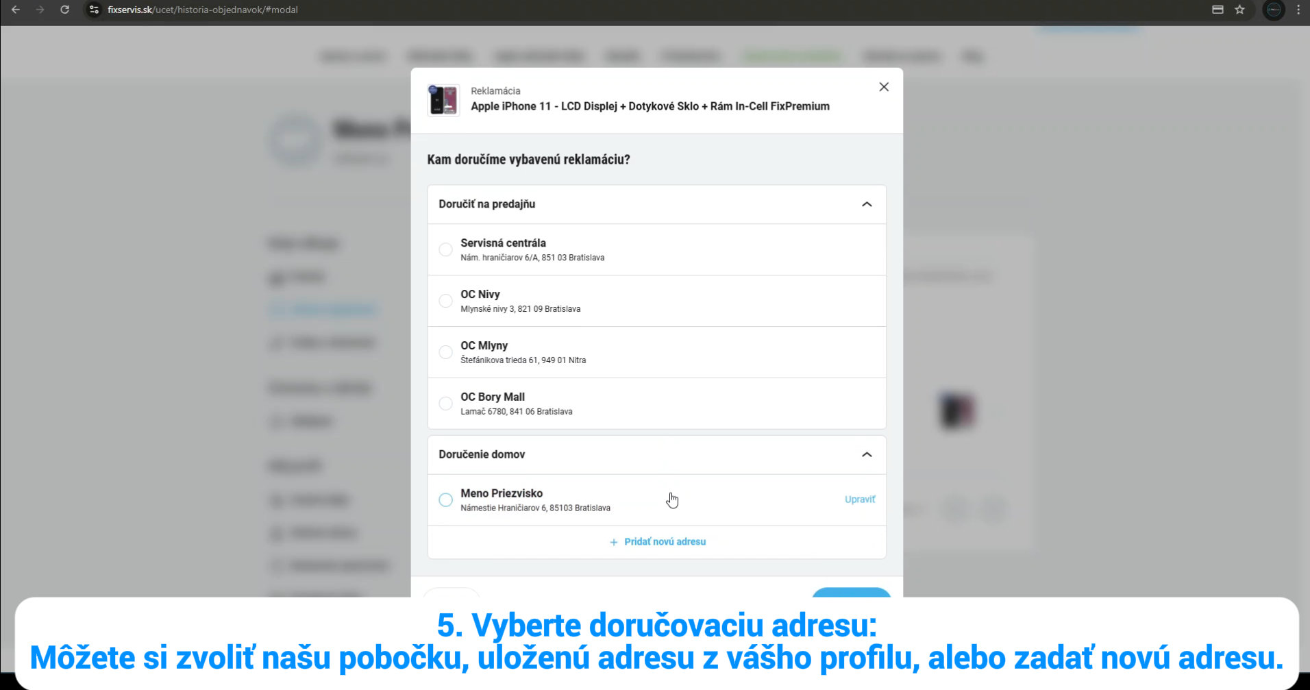 5. Vyberte doručovaciu adresu z uložených adries vo vašom profile, alebo zadajte novú.