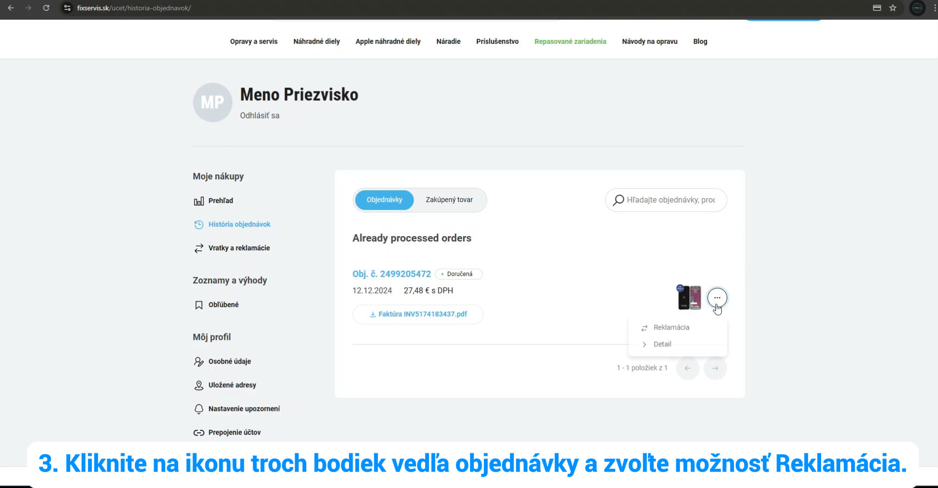 3. Kliknite na ikonu troch bodiek vedľa produktu a zvoľte možnosť Reklamácia. (Ikona/tlačidlo sa zobrazuje na základe záručných podmienok.)