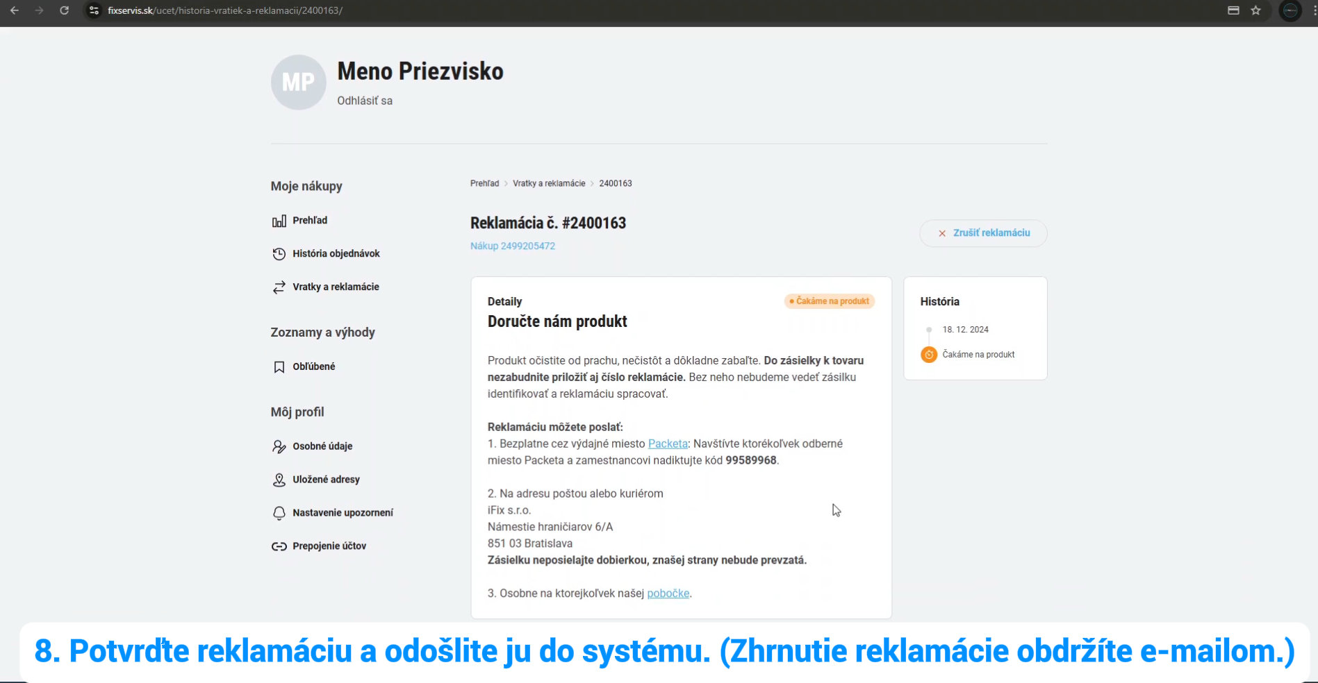9. Dôkladne zabaľte reklamovaný tovar v pôvodnom obale a priložte číslo reklamácie (ľahko ho spoznáte podľa znaku #). Následne sa vám zobrazia informácie o ďalšom postupe a budete mať možnosť výberu spôsobu odoslania tovaru: