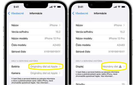 V systéme iOS 15.2 a novšom si môžete na obrazovke Nastavenia > Všeobecné > Informácie overiť diely a servisnú históriu svojho iPhonu.