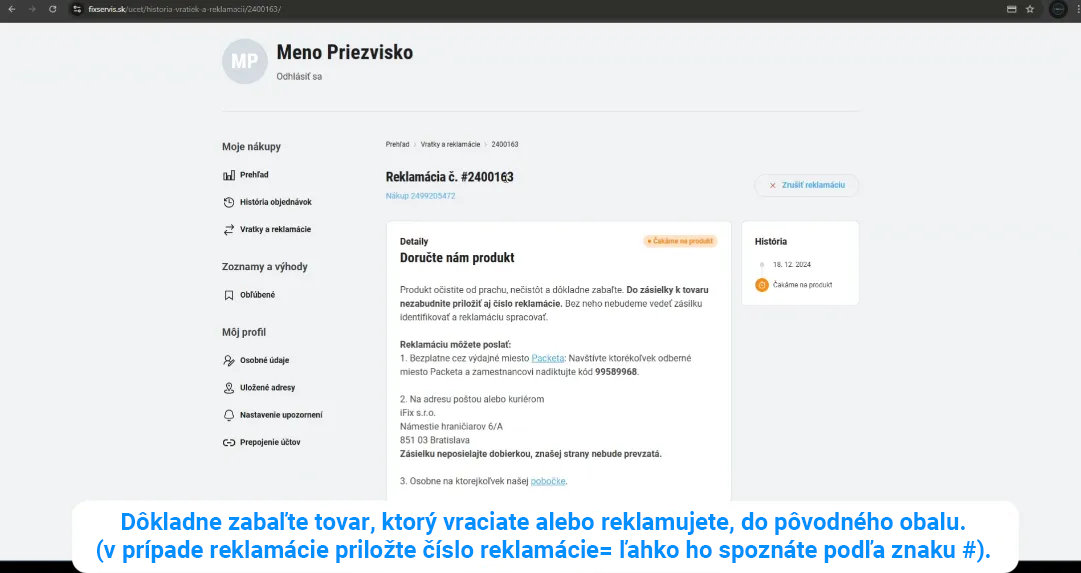 V prípade reklamácie tovaru je najskôr potrebné vykonať online alebo manuálnu reklamáciu a až následne pokračovať vrátením cez Packeta podľa návodu nižšie.